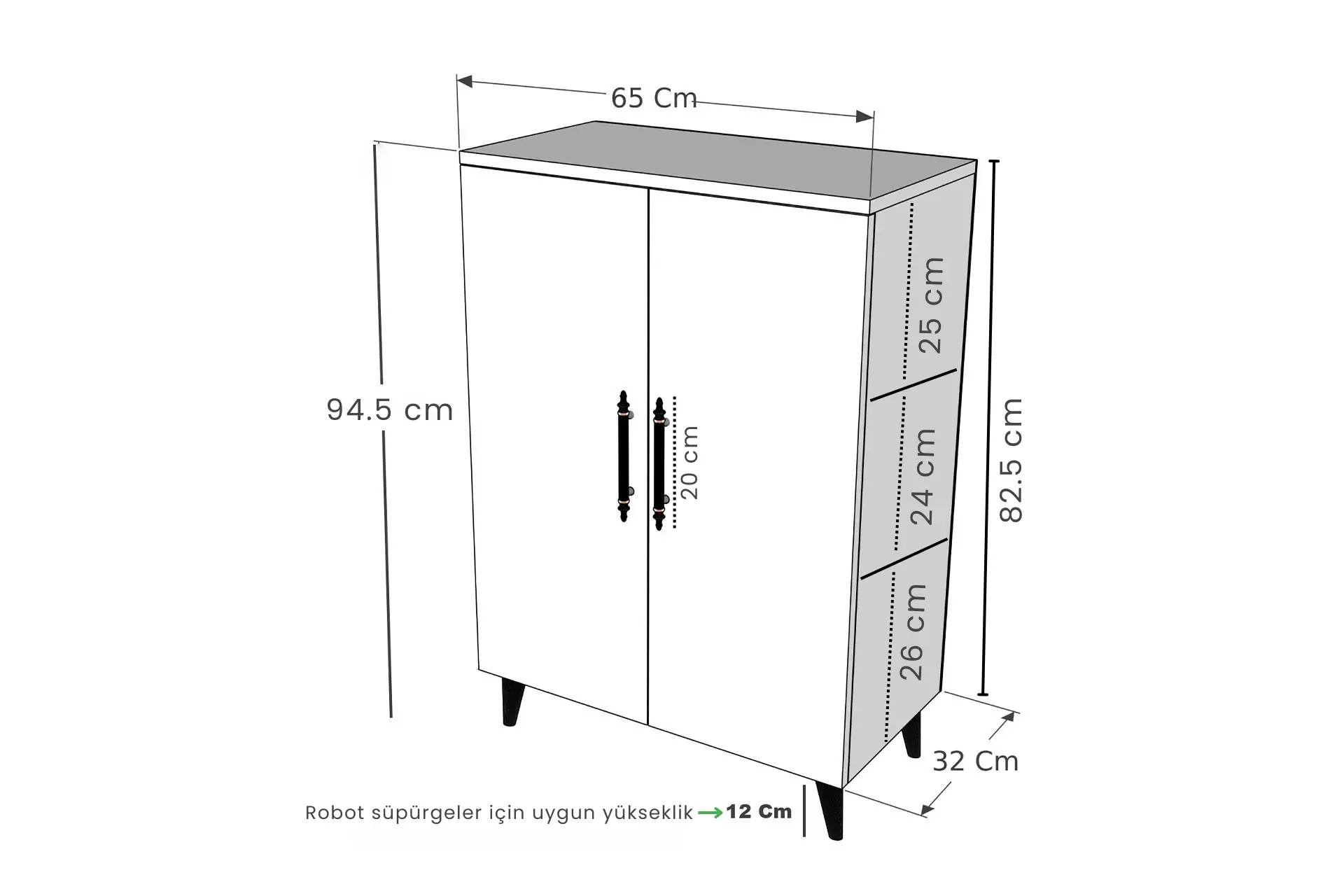 Yükseklik: 177 cm Genişlik: 65 cm Derinlik: 32 cm Raf Aralıkları: 26 cm Daha detaylı ölçüler görsellerde mevcuttur.