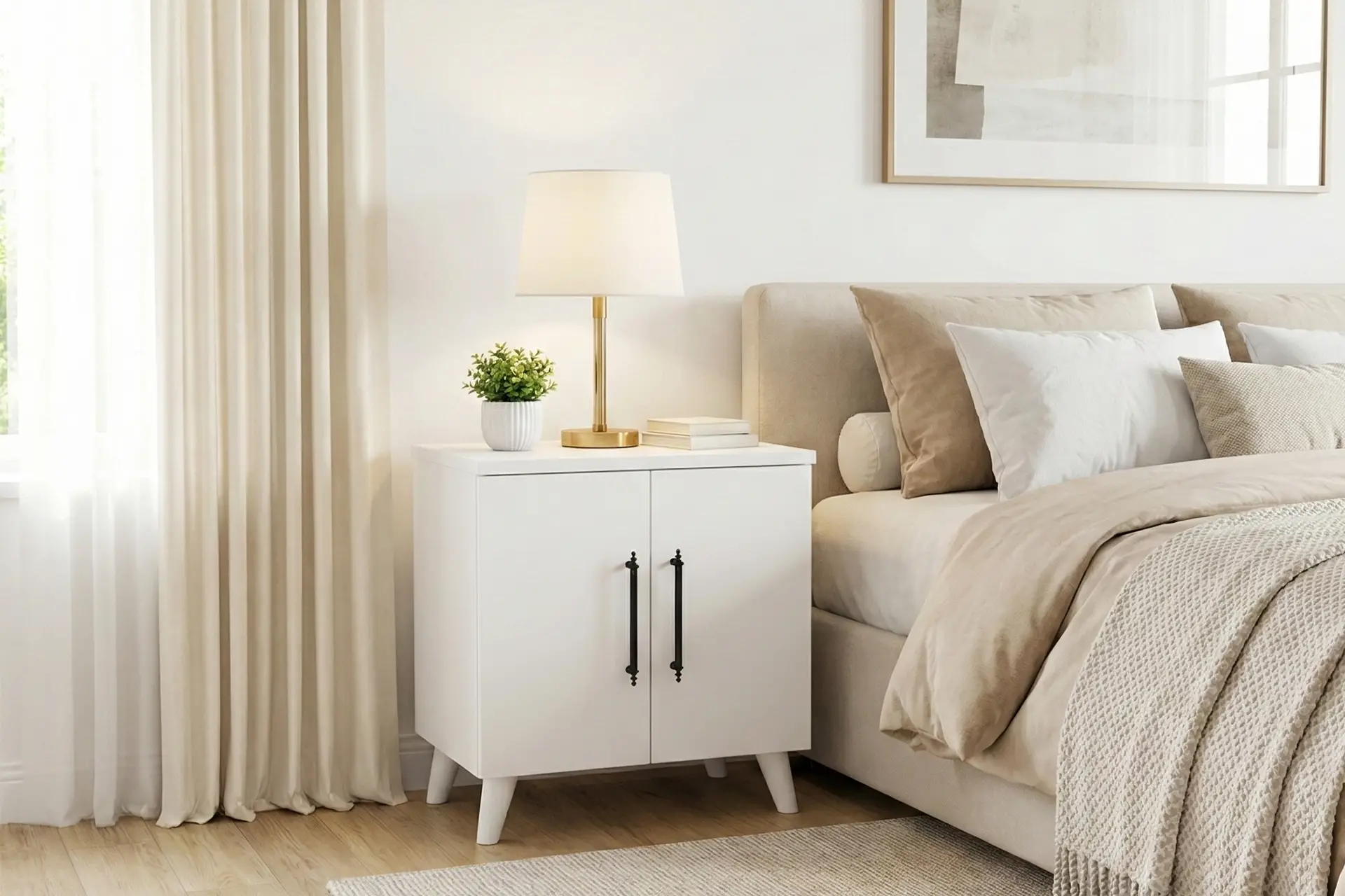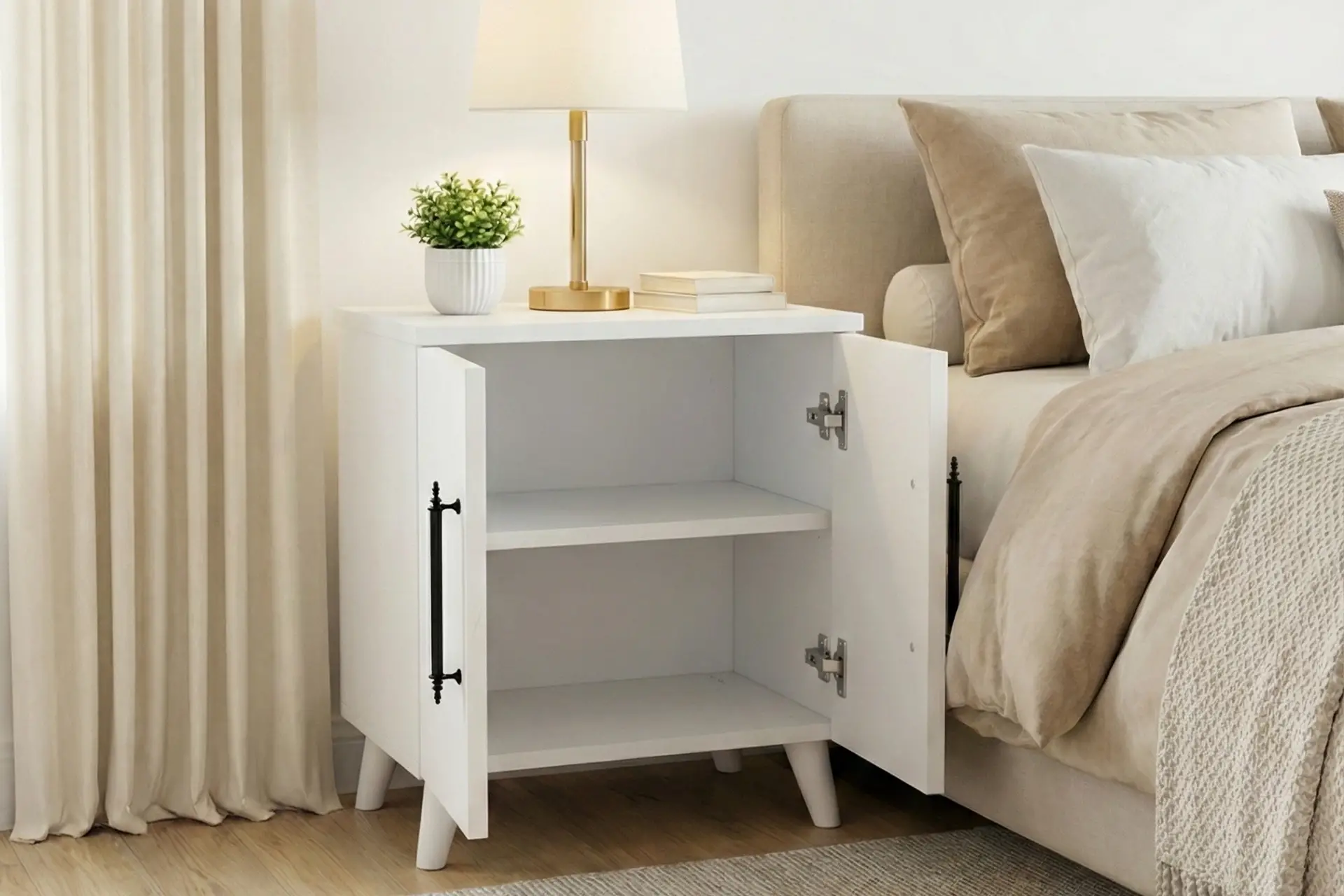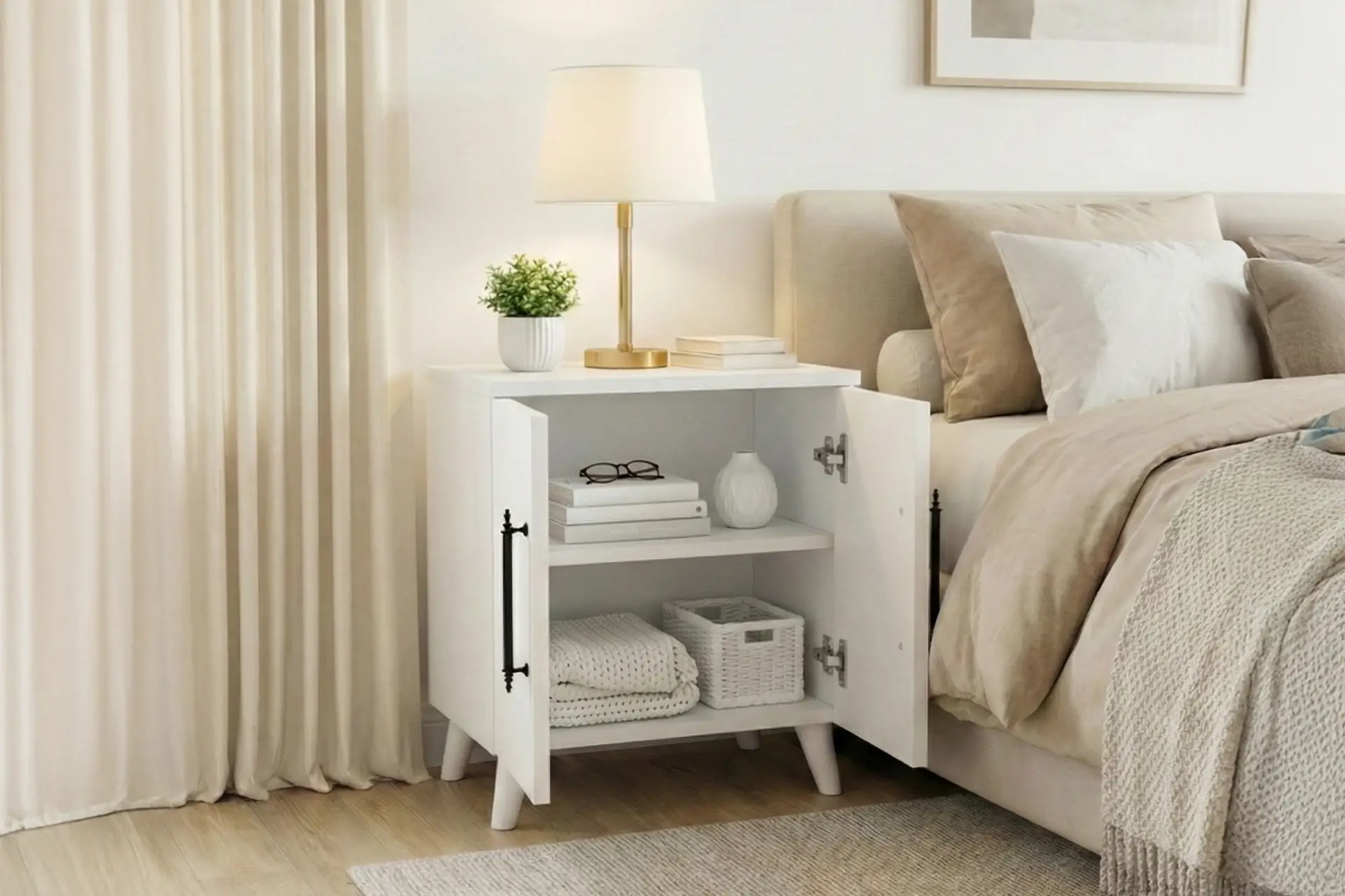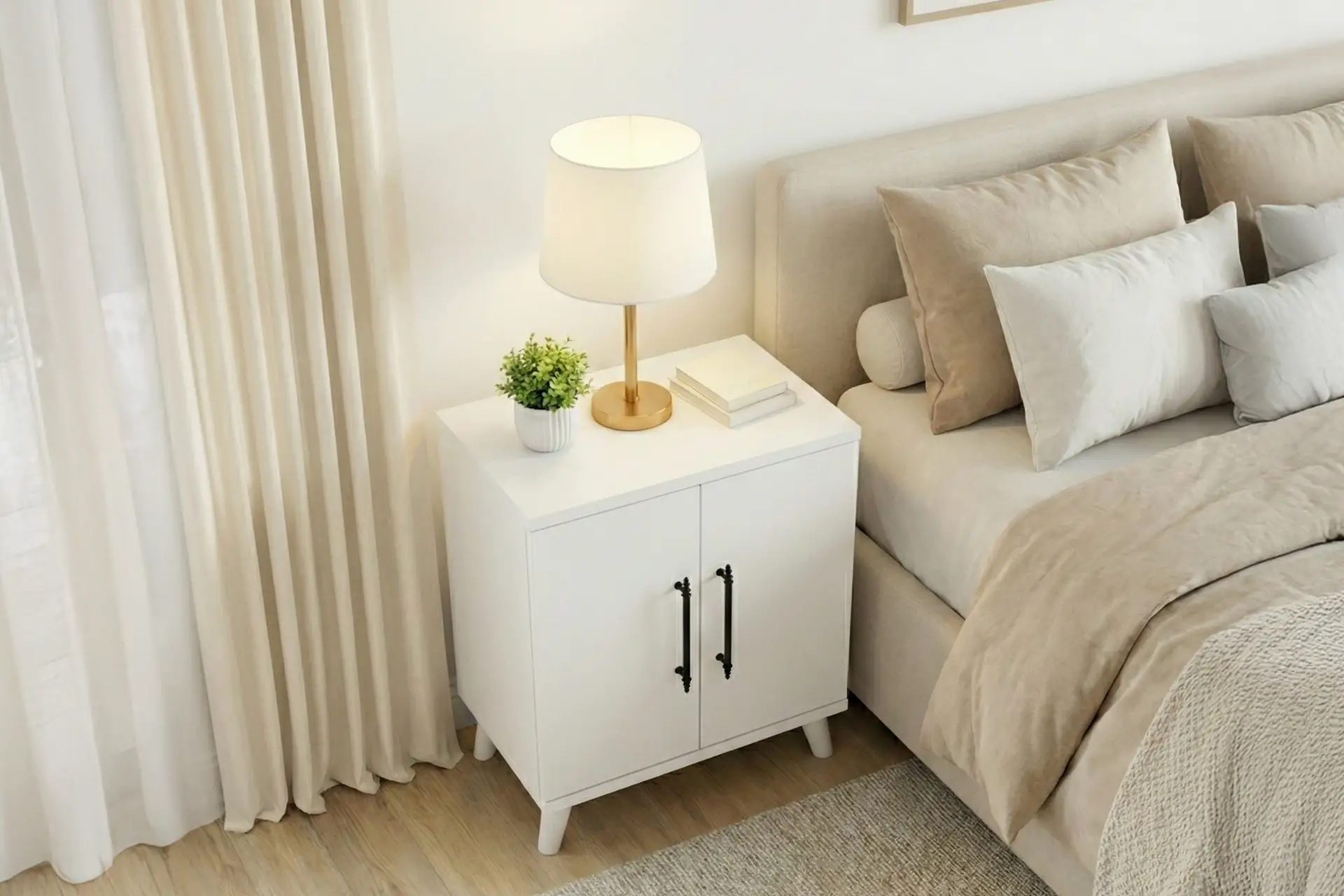 Lumen Komodin; klasik tasarımı, mat beyaz yüzeyi ve dengeli oranlarıyla yatak odasında sakin ve düzenli bir atmosfer oluşturur. İki kapaklı ve raflı iç yapısı sayesinde eşyalarınızı göz önünden uzak ama her zaman elinizin altında tutmanızı sağlar.