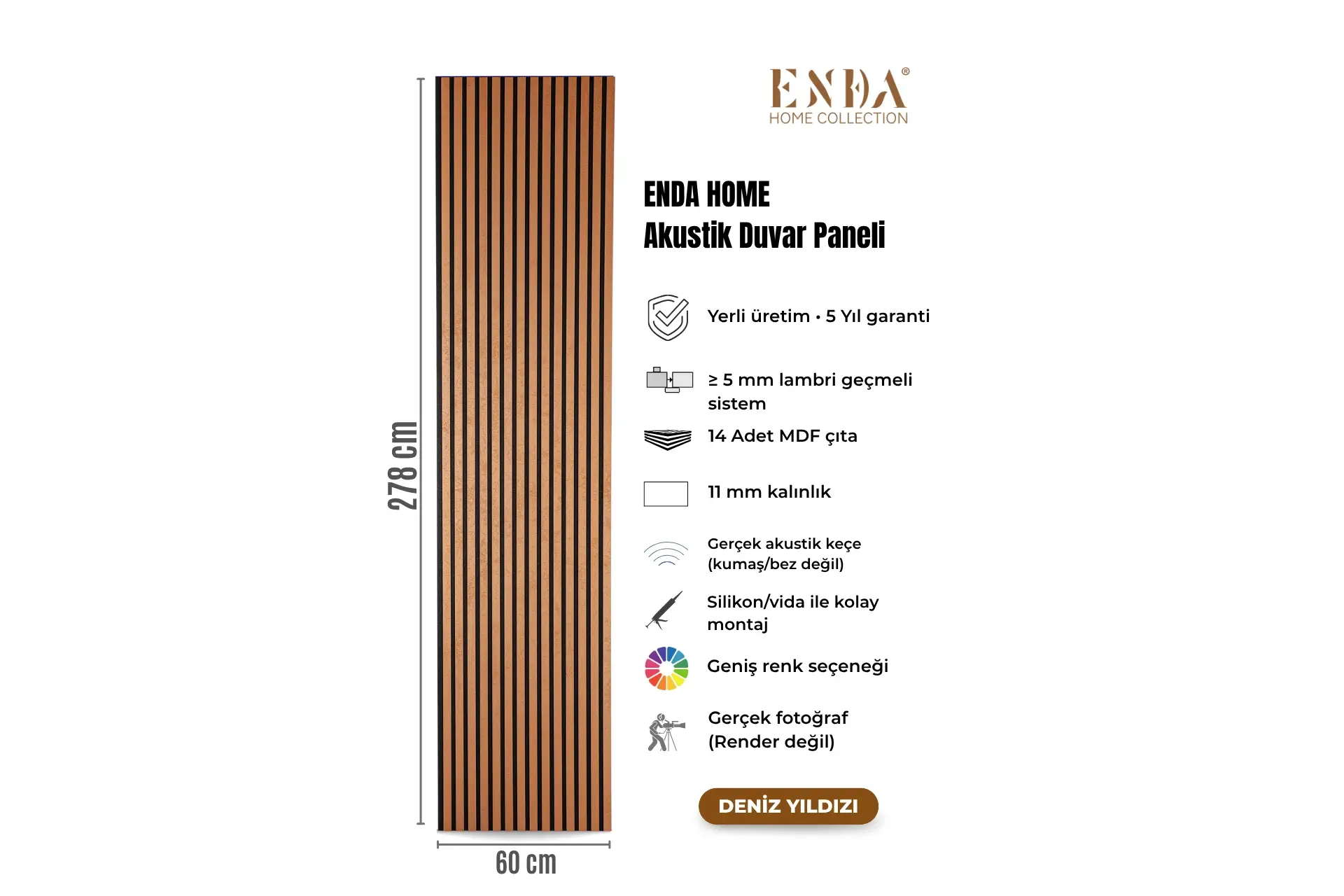 Enda Home tarafından üretilen bu paneller, yalnızca dekoratif amaçla değil; uzun ömürlü, sağlam ve güvenilir kullanım için tasarlanmıştır. Deniz Yıldızı rengi, mekânınıza sıcaklık ve aydınlık katarak zarif bir denge oluşturur.
